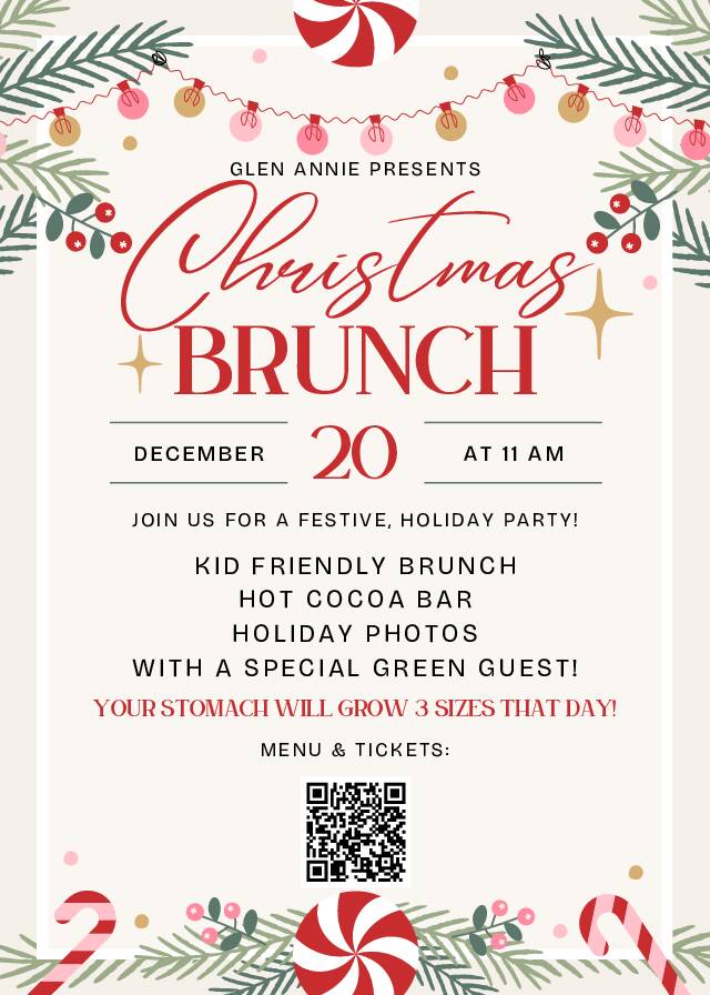 Get ready to kick off the season with sparkle, smiles, and a whole lot of holiday cheer! Join us on December 20th at 11 AM for Glen Annie’s festive Christmas Brunch, filled with delicious food, family fun, and magical moments.