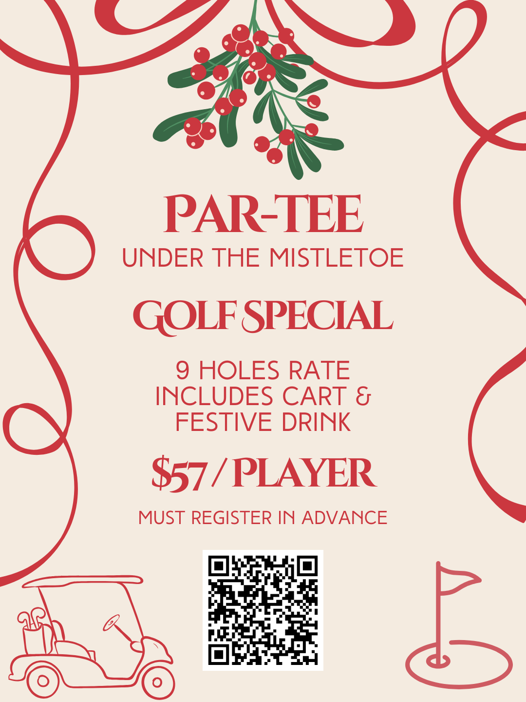 Join us on Sunday, December 7th, for 9 holes starting at 4 PM — your green fee, cart fee, and a drink are all included.