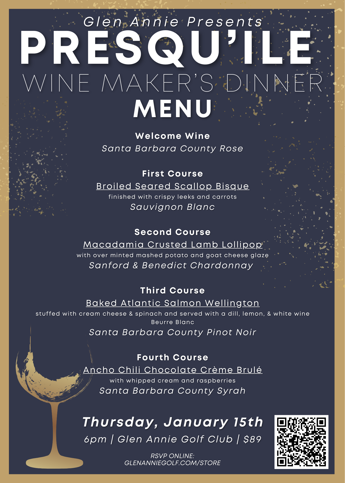 Glen Annie Golf Club invites you to enjoy a memorable evening of great wine and inspired cuisine featuring Presqu’ile Winery, a standout estate from Santa Barbara County’s Santa Maria Valley.